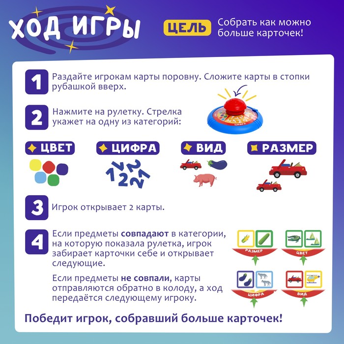 - Побеждает тот, кто соберёт больше карточек, чем остальные.
