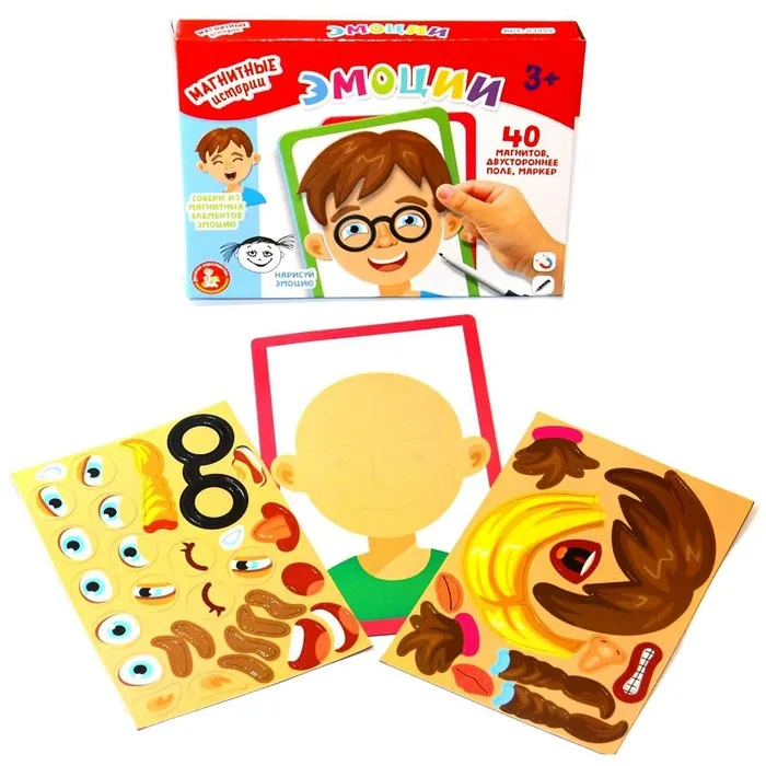 Игра состоит из 40 магнитных элементов (6 эмоций) и двустороннего магнитного поля.