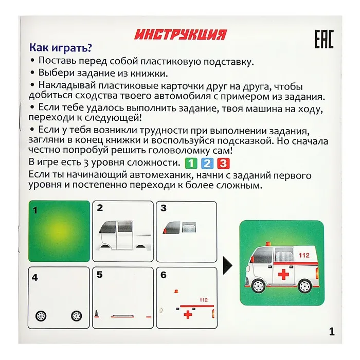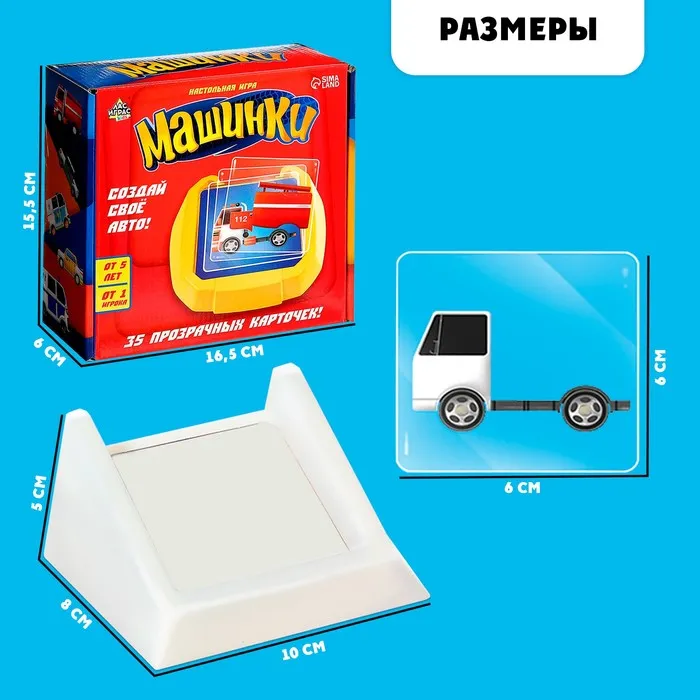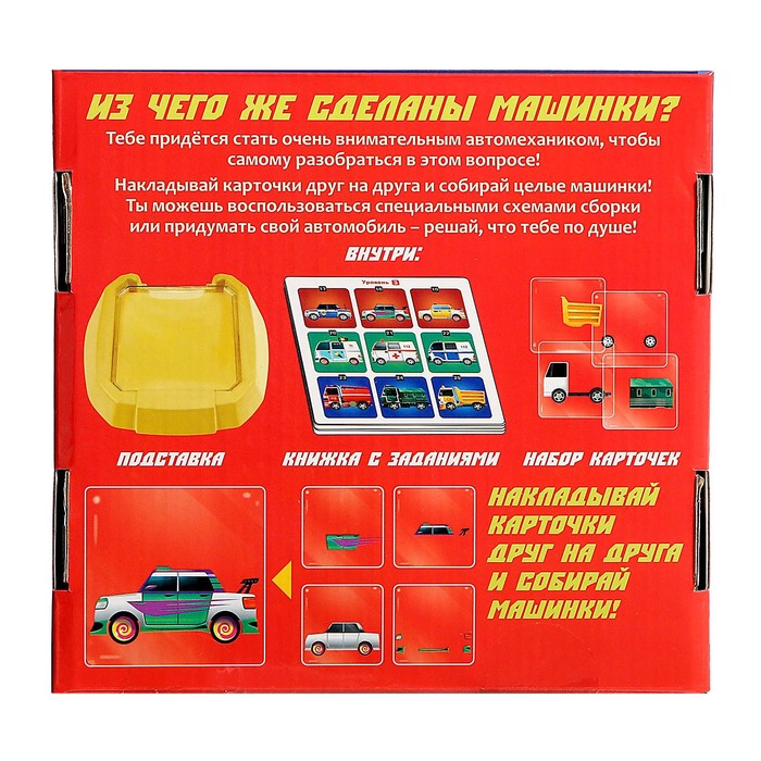 Станьте настоящим автомехаником в настольной игре «Машинки»! Накладывайте друг на друга карточки и собирайте полноценные автомобили! Проявляйте фантазию — собирать машины можно не только по специальным схемам сборки, но и придумывать свои!