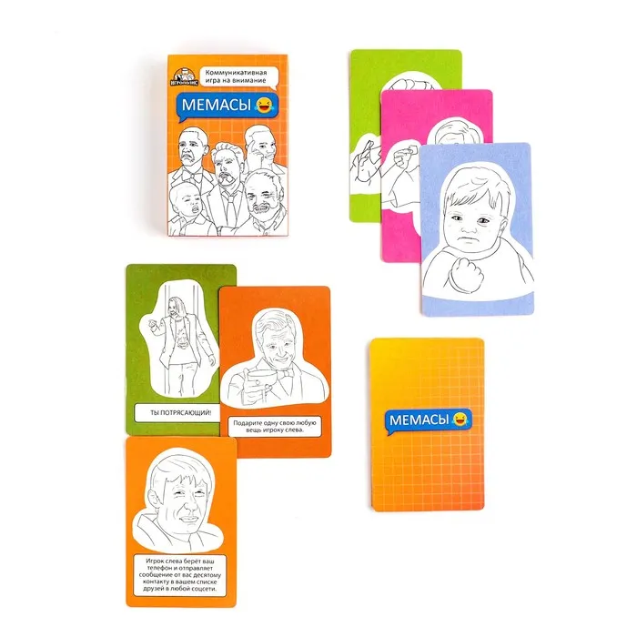 Мемасы — карточная игра для знатоков мемов. Выкладывайте с друзьями карточки, переворачивайте их попарно и находите совпадающие.