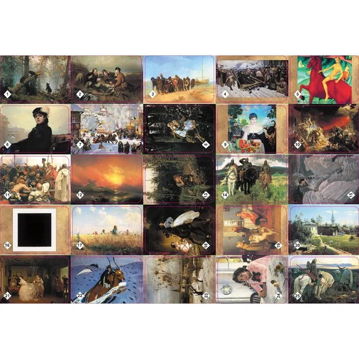 «Картины русских художников» — это разновидность игр мемо. Их особенность в том, что успех зависит не от удачи, а от способностей и стараний игроков. Набор состоит из 50-ти карточек с парным изображением произведений искусства.