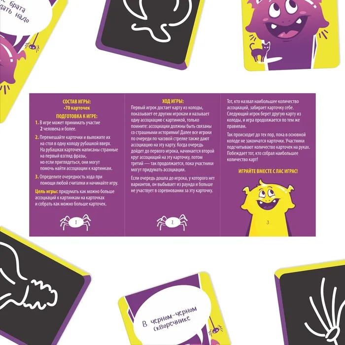Игроки по очереди вытягивают карточки из колоды и называют одну ассоциацию с изображённой картинкой. Только помните: ассоциации должны быть связаны со страшными историями!