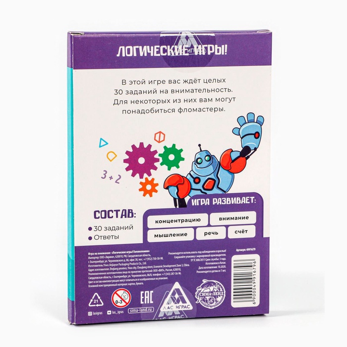 В этой игре вас ждёт 30 заданий на внимательность, в которых нужно искать определённую фигуру среди других, разгадывать шифры, проходить лабиринты, составлять рисунки по координатам и многое другое!