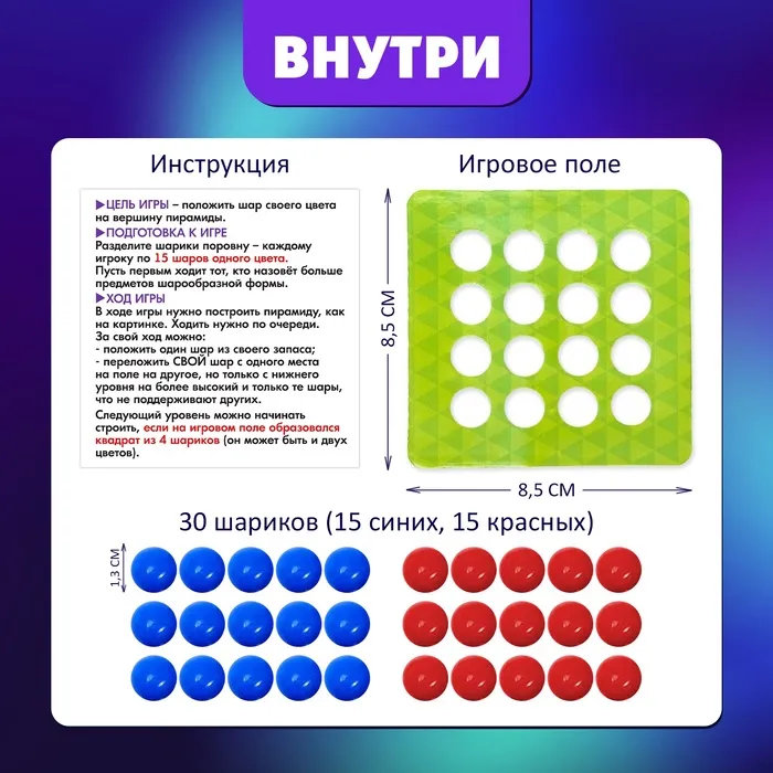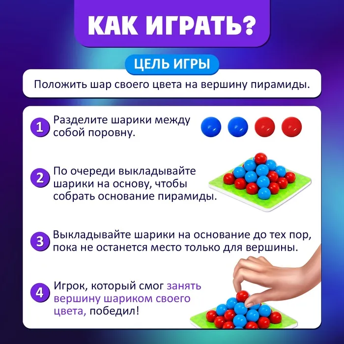 У каждого игрока есть 15 шаров одного цвета. Выкладывая их по одному на игровом поле, вы должны построить пирамиду. Чтобы вы выиграли, именно ваш шар должен оказаться на вершине. Продумывайте стратегию, используйте хитрые ходы, и именно вы станете повелителем пирамиды!