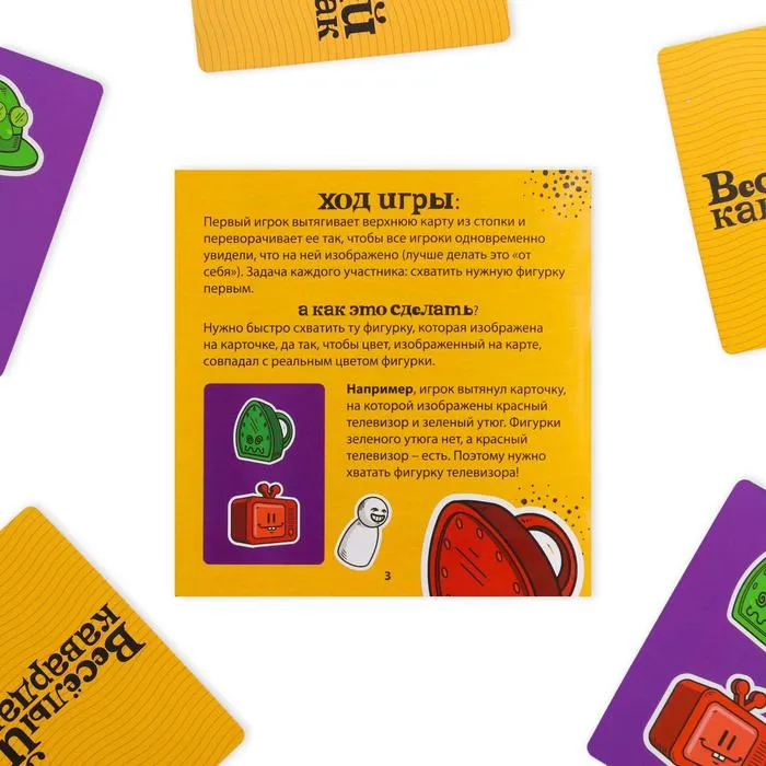 Первый игрок начинает игру и переворачивает верхнюю карточку из колоды так, чтобы все остальные одновременно её увидели. А дальше каждый сам за себя: нужно первым схватить нужный предмет — изображенную фигурку! Если успели — заберите карточку себе, а вещь положите обратно. Если на карточке нет ни одного необходимого изображения, важно быстро схватить фигурку или цвет, которых нет на картинке. Победит тот, кто соберёт наибольшее количество карточек!