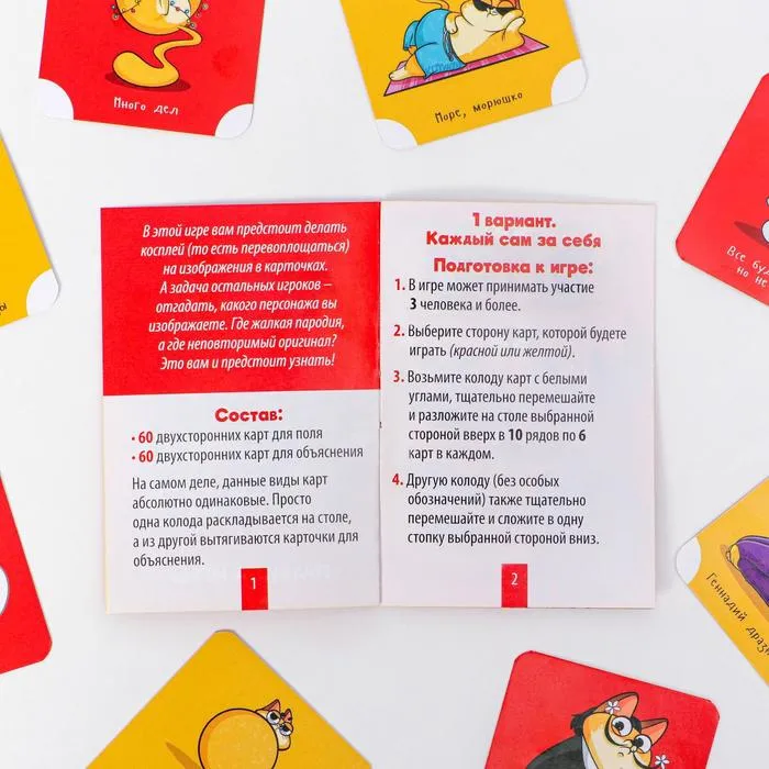 Участники по очереди вытягивают карточки из колоды, а затем повторяют позы и мимику персонажа на картинке. Двигаться при этом не нужно. Издавать звуки тоже. Чтобы максимально передать изображение, игрок может взять любой подручный предмет.