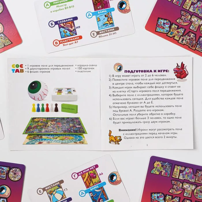 Для начала выберите поле с иллюстрациями, которое будете использовать сегодня. Для удобства каждое поле отмечено буквами от А до Е. Тщательно перемешайте карточки и сложите их в одну колоду рубашкой вверх рядом с полем для передвижения. Туда же поместите пластилин.