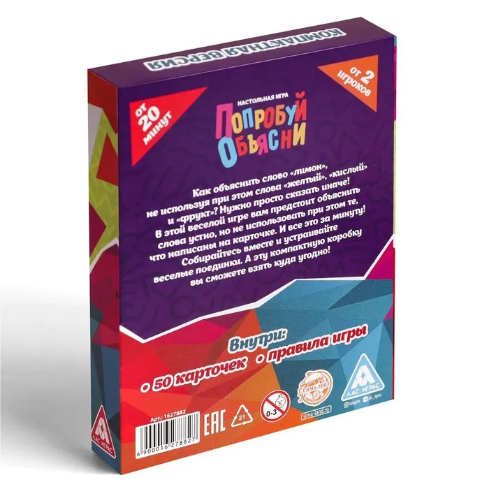 Вытягивайте карточки и устно объясняйте написанное на них. Но делайте это не так, как обычно! Во время игры нельзя использовать три слова, перечисленные на картинке. Всего в наборе целых 50 карточек. Слова на них простые, так что будет интересно и взрослым, и детям. А компактный размер коробки позволит взять эту игру куда угодно!