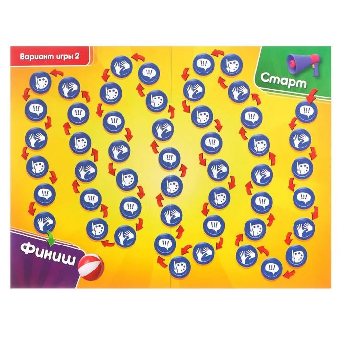 Необходимо первыми добраться до финиша на игровом поле, вытягивая карточки из колоды и объясняя слова, написанные на них. Делать это можно тремя способами: пантомимой, рисунком или словами. Вы сами выбираете слово и видите способ его объяснения.