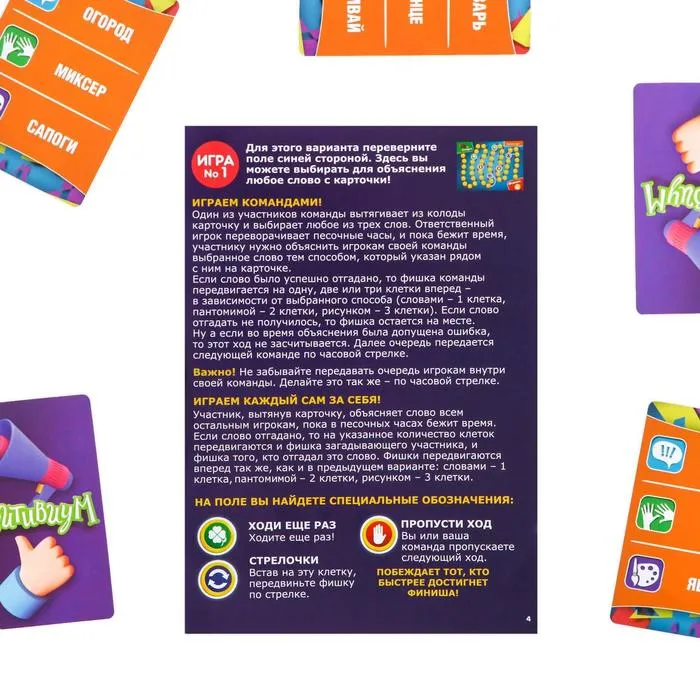 Игра усложняется тем, что время объяснения слова строго ограничено, для этого в наборе предусмотрены песочные часы. Объясняющий выбирается заранее. Если команда правильно угадала слово, она продвигается вперед, если не успела угадать – остается на месте.
