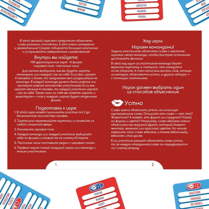 Вам предстоит объяснять слова разными способами. Скорее делитесь на команды, раскладывайте поле и начинайте игру!
