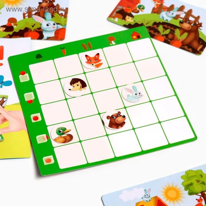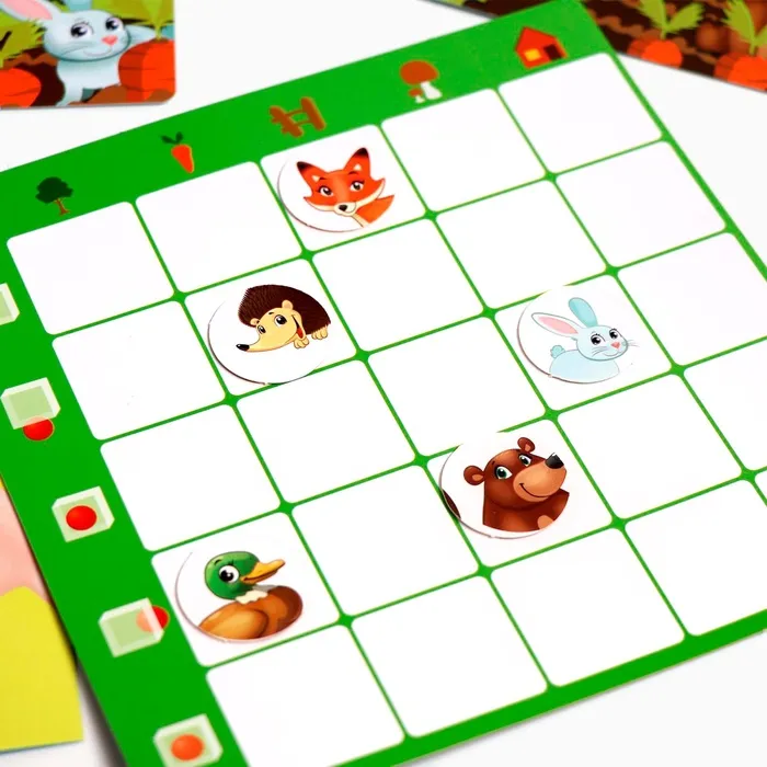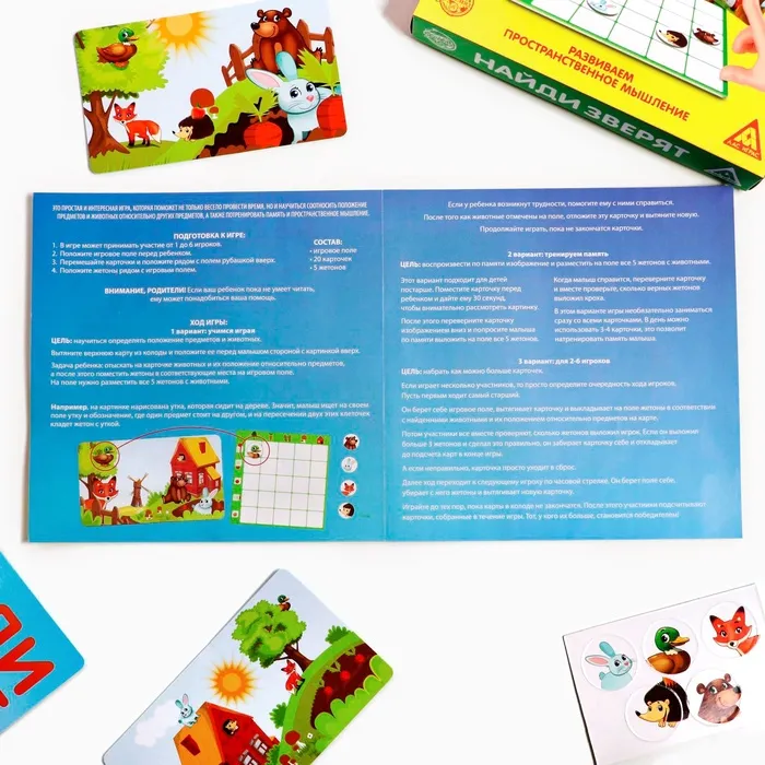 Задача ребёнка — отыскать на карточке животных и определить их положение относительно предметов, а после этого поместить жетоны на соответствующие участки игрового поля. На нём нужно разместить все 5 жетонов с животными.
