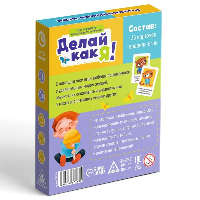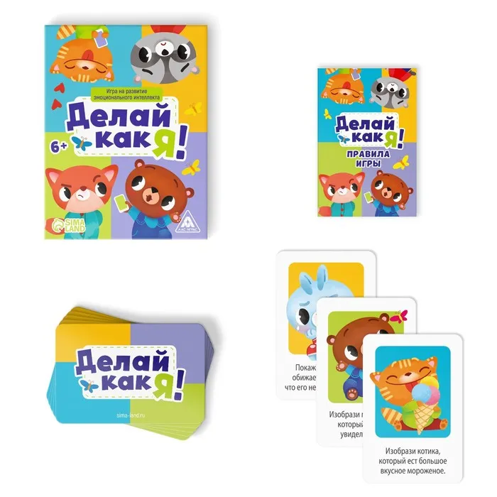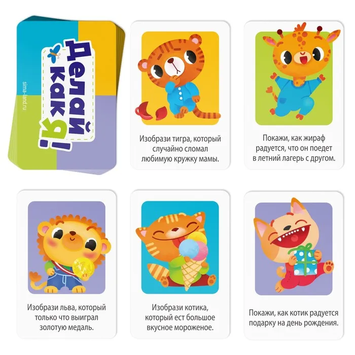 Задача ребёнка — изобразить эмоцию и ситуацию, изображенную на карточке. Так малыш познакомится с широким спектром человеческих выражений, и научится их распознавать.