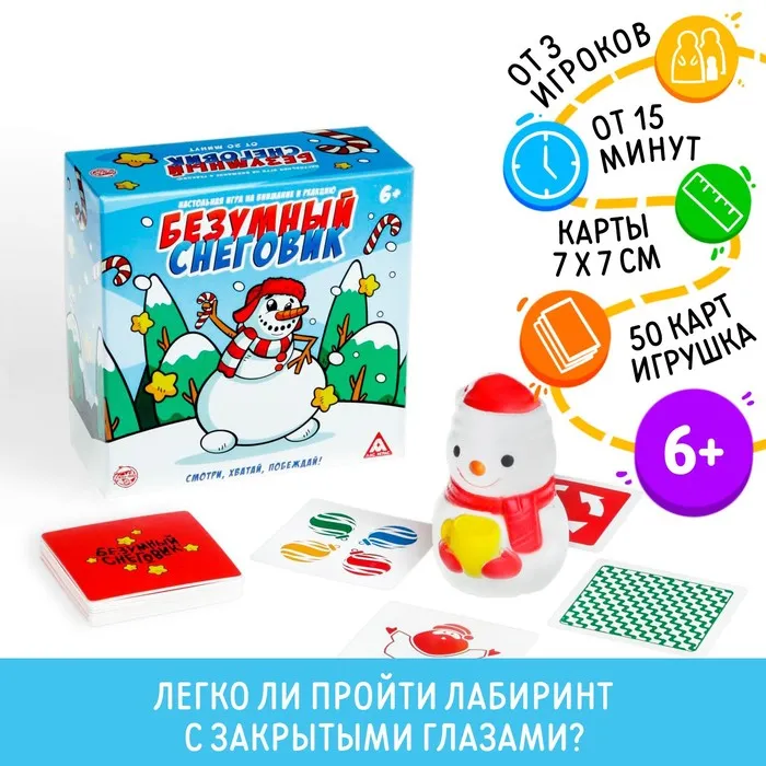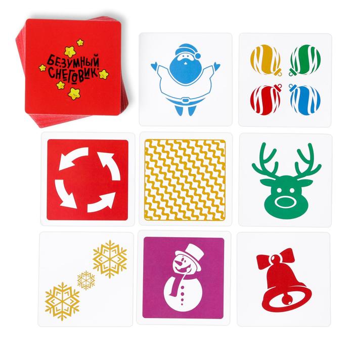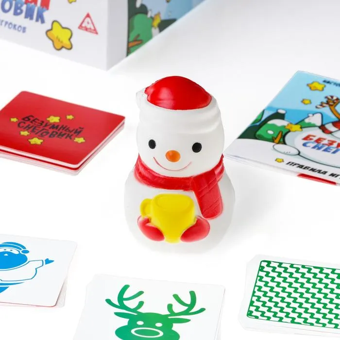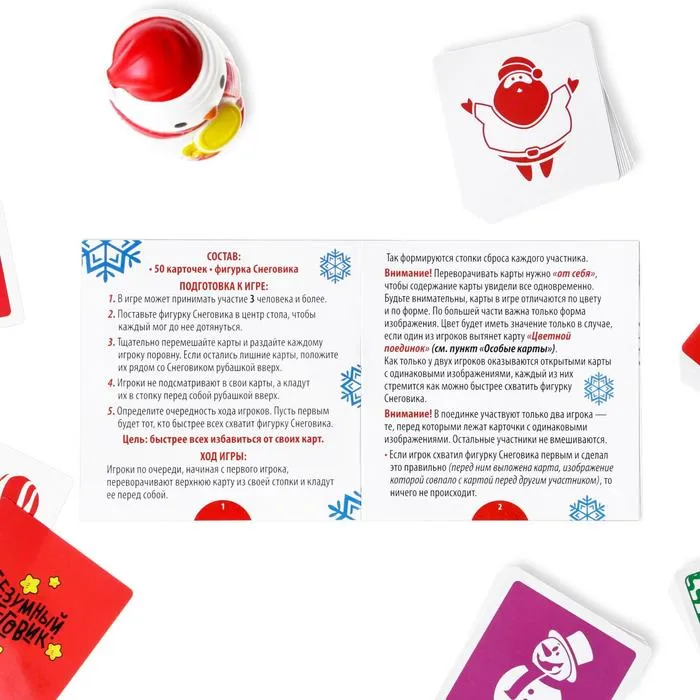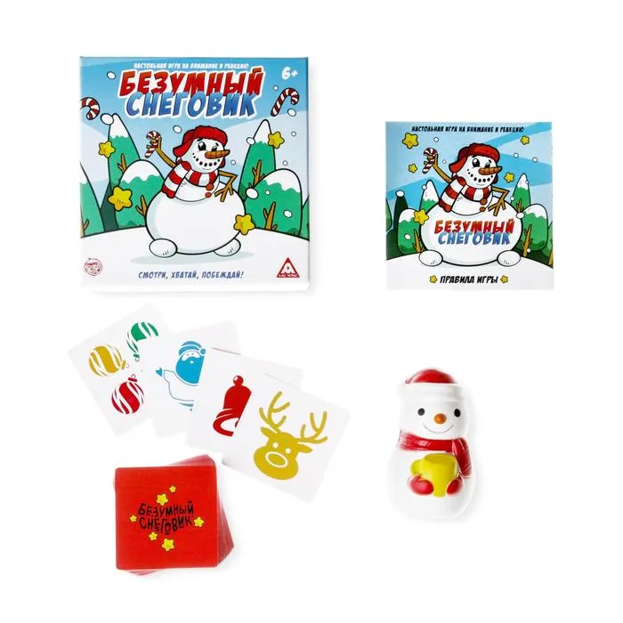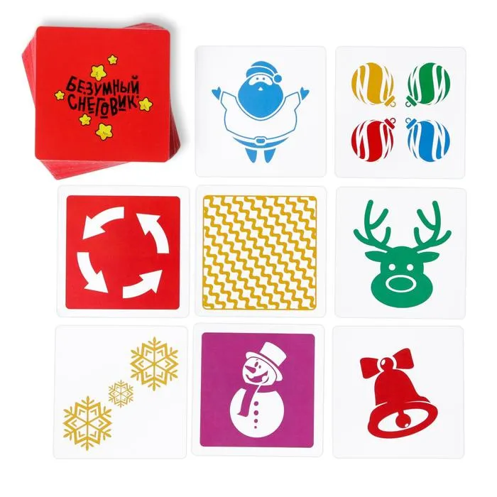 В коробке вас ждут 50 карточек с изображениями. На первый взгляд, ничего общего между ними нет, но если присмотреться... есть несколько одинаковых! Выкладывайте их по очереди и ищите совпадения. Нашли? Первым хватайте фигурку Снеговика.