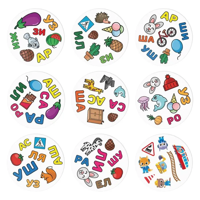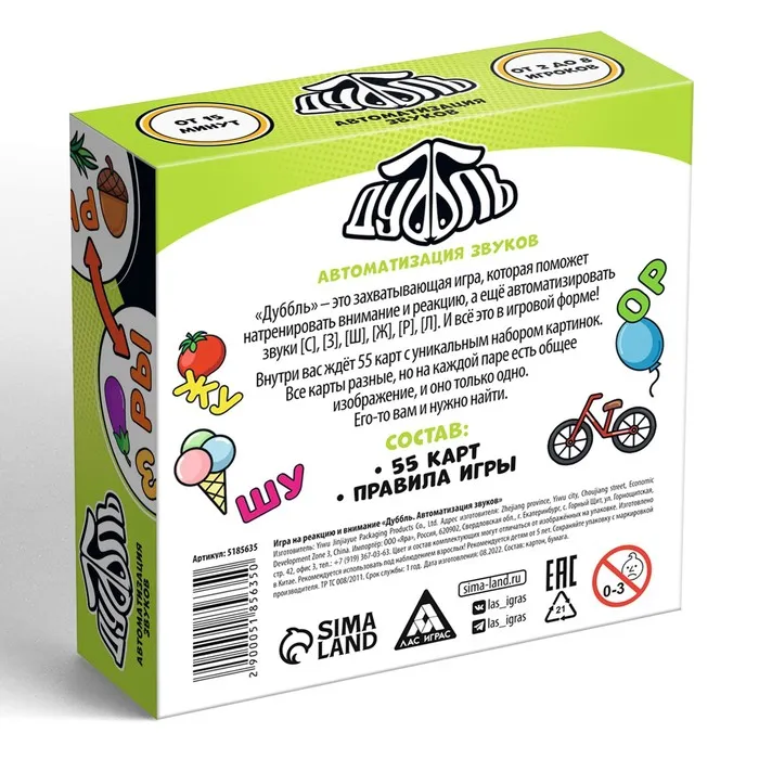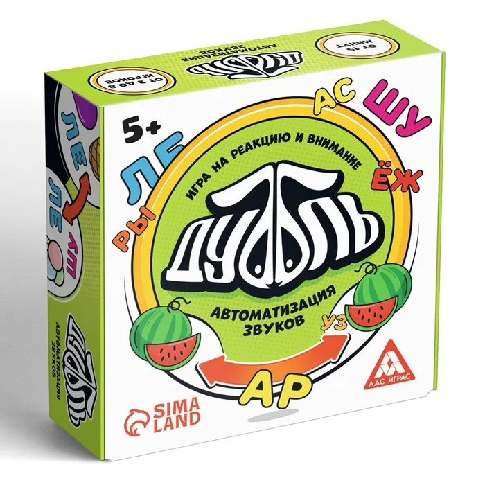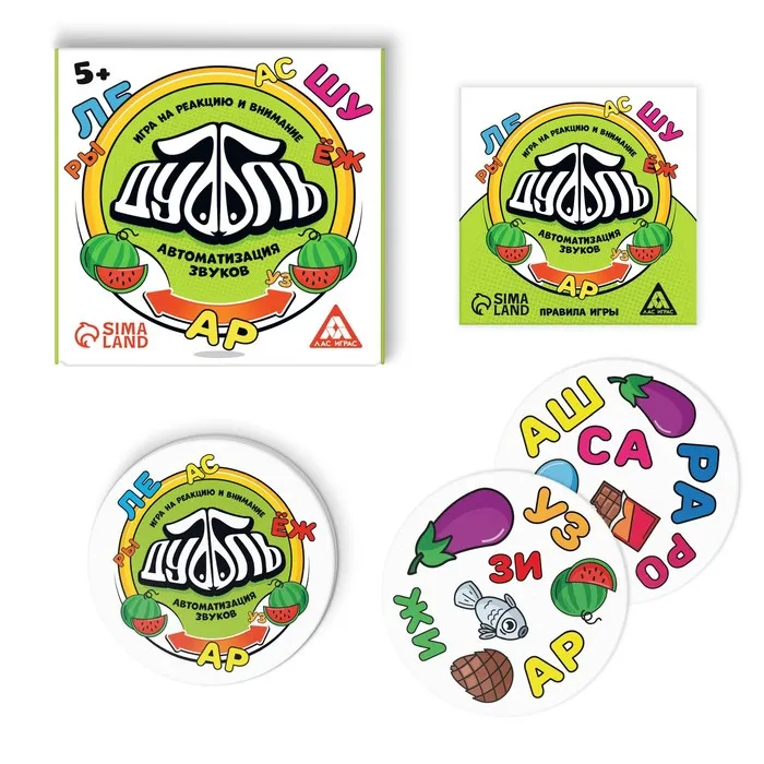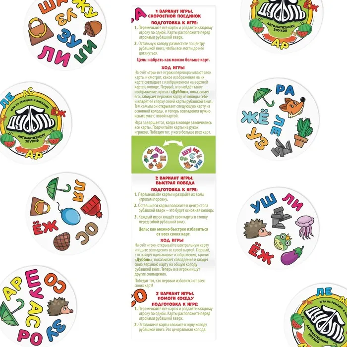 Дуббль — это захватывающая игра, которая поможет натренировать внимание и реакцию, а ещё автоматизировать звуки [с], [з], [ш], [ж], [р], [л]. И всё это в игровой форме! Внутри вас ждёт 55 карт с уникальным набором изображений. Все карты разные, но на каждой паре есть общая картинка, и она только одна. Её-то вам и нужно найти.