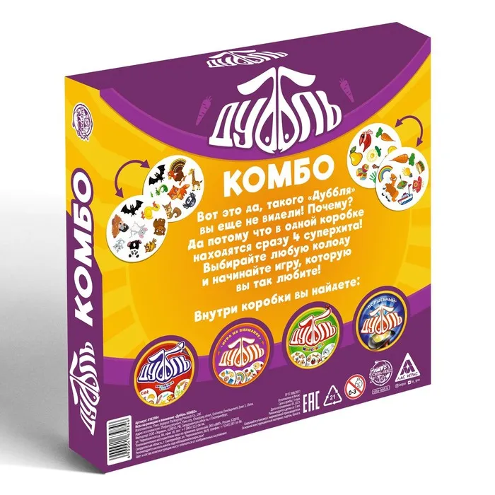 Дамы и господа, приготовьтесь. Представляем вашему вниманию «Дуббль Комбо»! Мы собрали 4 самых популярных игры и сложили всё в одну коробку. Теперь тренировать внимание и реакцию будет ещё интереснее!
