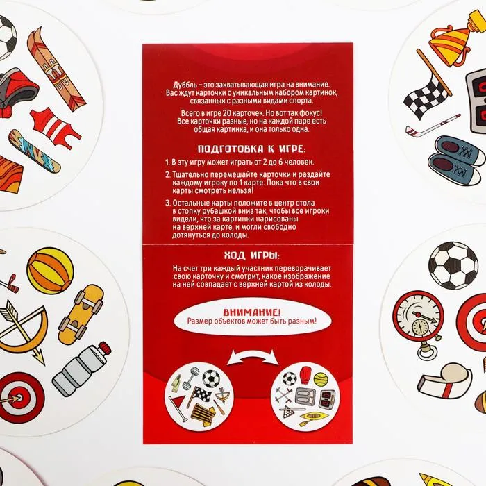 Внутри вас ждут карты с уникальными картинками, на всех есть общие элементы. Ищите одинаковый спортивный инвентарь и побеждайте!