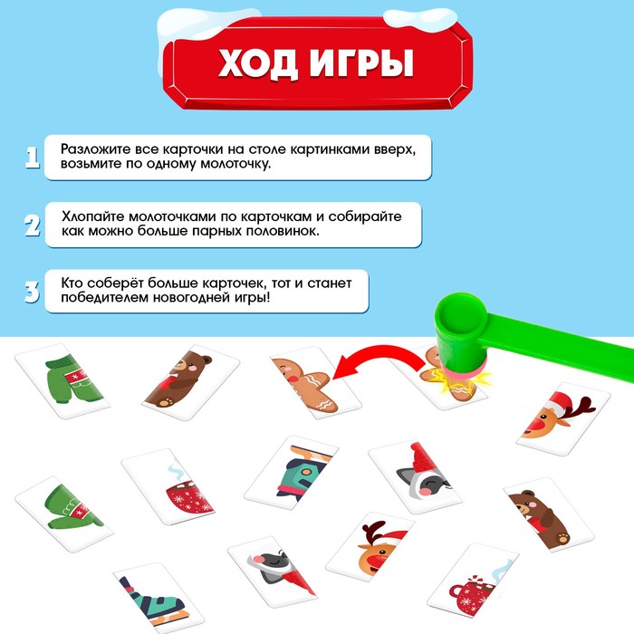 Настольная игра «Весёлые молоточки» научит вас быстро и правильно находить одинаковые половинки и складывать новогодние картинки.