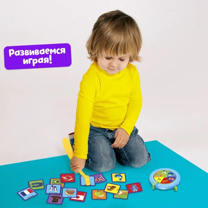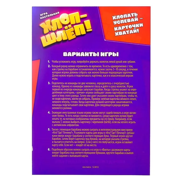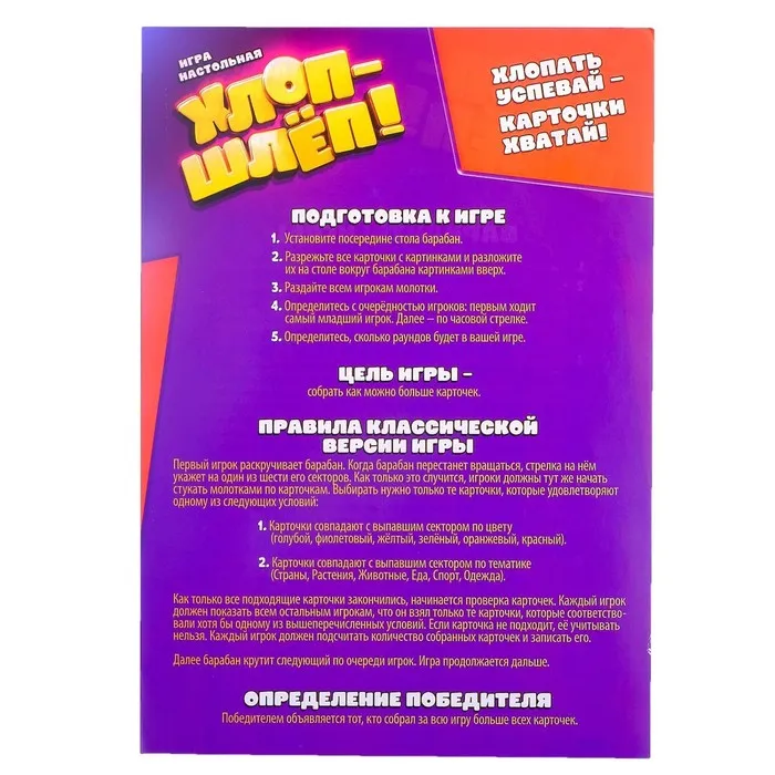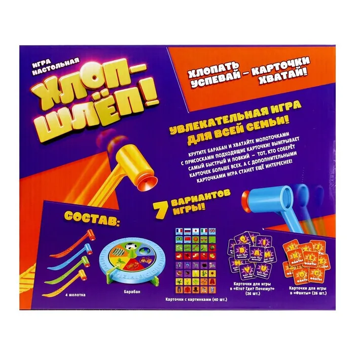Разложите все карточки по игровому полю картинками вверх. Один из игроков должен раскрутить барабан. Когда его стрелка остановится на одном из секторов, все игроки одновременно начинают своими молоточками выхватывать карточки, которые по тематике и цвету подходят выпавшему сектору. Кто соберёт их больше, тот и считается победителем раунда. Помимо основного варианта игры, есть ещё 6 вариантов, один из которых с фантами, а другой – с викториной.