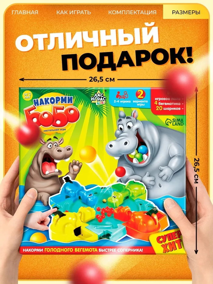 Цель игры — накормить голодного бегемота быстрее соперника! Выберите цвет своего героя, займите позицию. На игровом поле разместите шарики. По команде «Время обеда!» нажимайте на хвостики животных. Чем быстрее вы это делаете — тем больше животное успевает проглотить. Победителем становится тот, кто насытил своего зверька максимальным количеством шаров.
