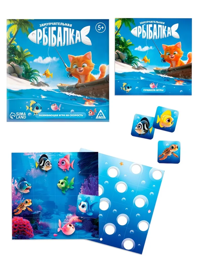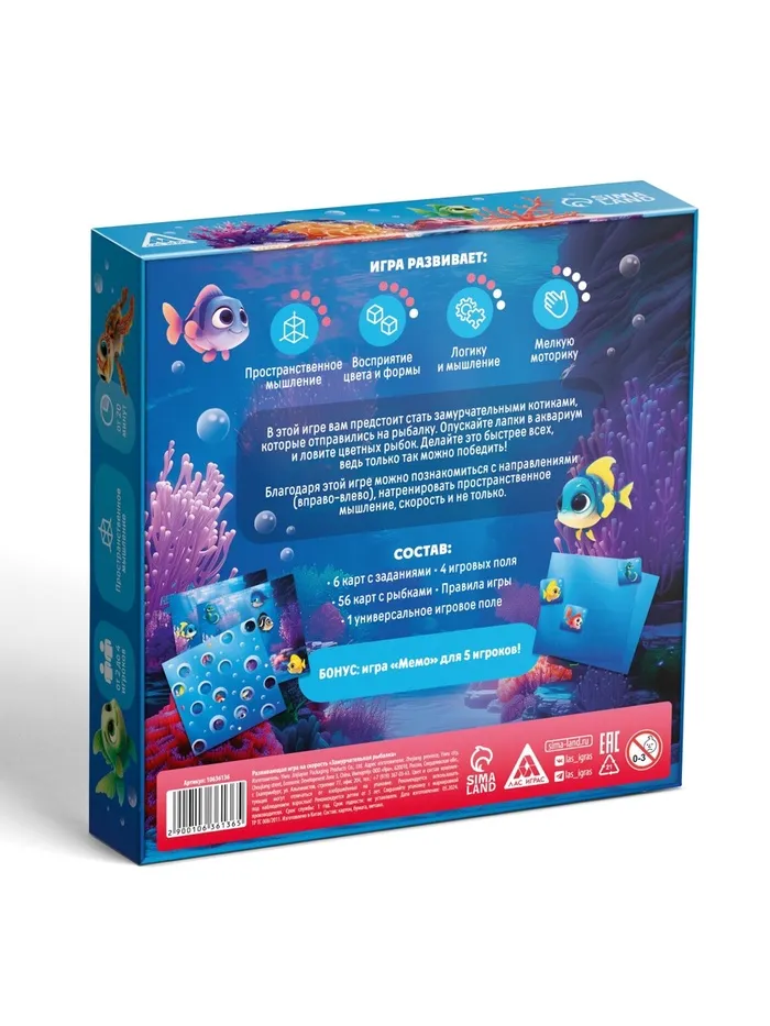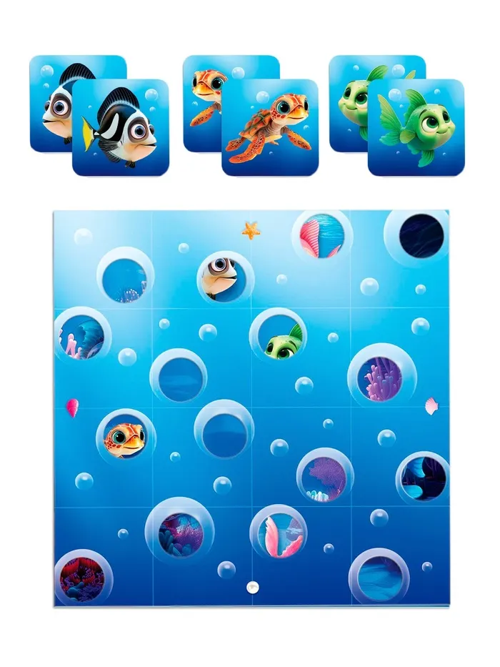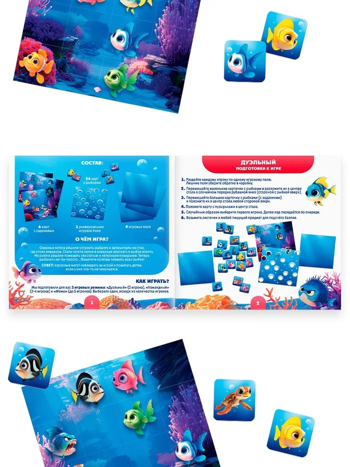 На игровом поле размещаются 28 карт (14 различных видов рыб по 2 карты каждого вида) изображением вниз. Задача игроков – найти все пары, как в классической игре “Мемо”. Чем больше пар соберёте, тем выше ваши шансы на победу!