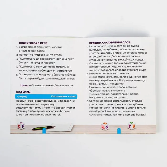 Подготовьте для каждого участника лист бумаги и пишущий предмет, возьмите секундомер (это могут быть песочные часы или телефон). Первый игрок берёт все кубики и бросает их, а затем включает секундомер. Задача участников (включая того, кто бросал кубики): за 3 минуты придумать как можно больше слов и записать их на свой листок.