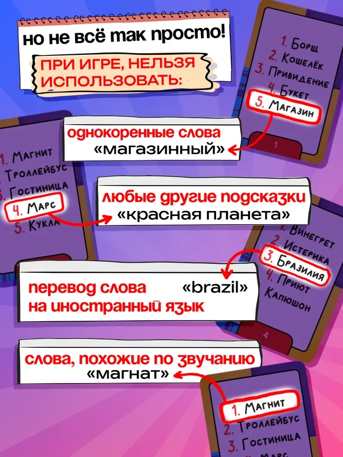 Отгаданное слово даёт по 1 баллу игрокам: объясняющему и отгадавшему. Запрещается говорить однокоренные слова!
