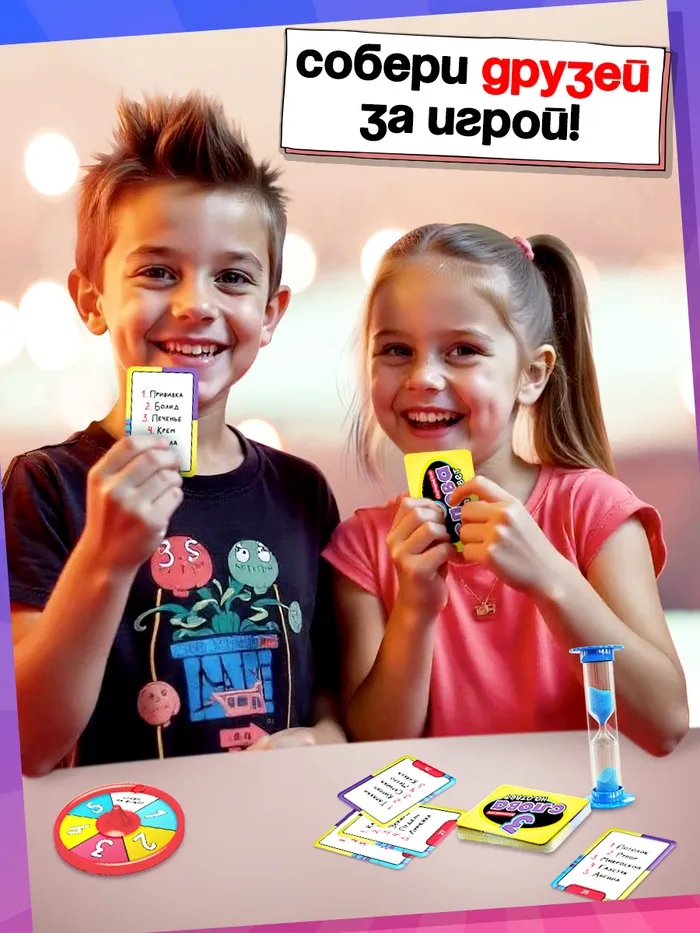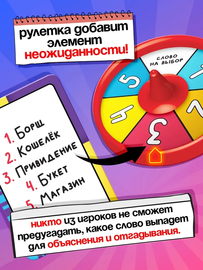 Правила игры просты: крутите рулетку, берите карточку, прочитайте слово, но никому его не говорите. Переворачивайте песочные часы, и, пока бегут секунды, придумайте 3 слова, с помощью которых команда отгадает, что написано на карточке.