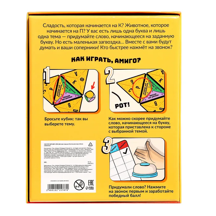 «Начос отвечачос» — это настольная игра для 2 и более игроков, в которой участники соревнуются в эрудиции и скорости реакции. Вам предстоит быстрее других придумывать слова на заданную тему и букву, нажимать на звонок быстрее соперников и получать за это баллы.