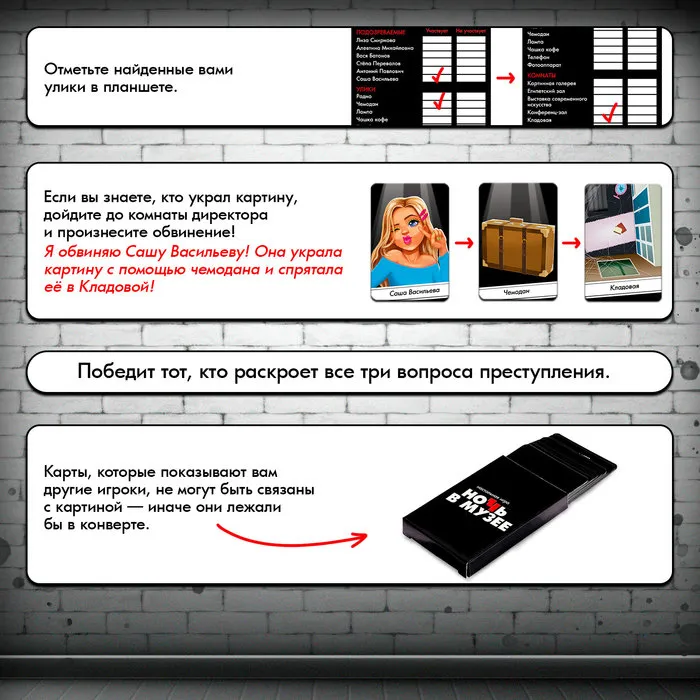 «Ночь в музее» — настольная игра для детей от 8 лет. Ребёнок окажется в центре детективных событий. Сюжет привлечет внимание юного сыщика и погрузит в мир тайн и загадок.