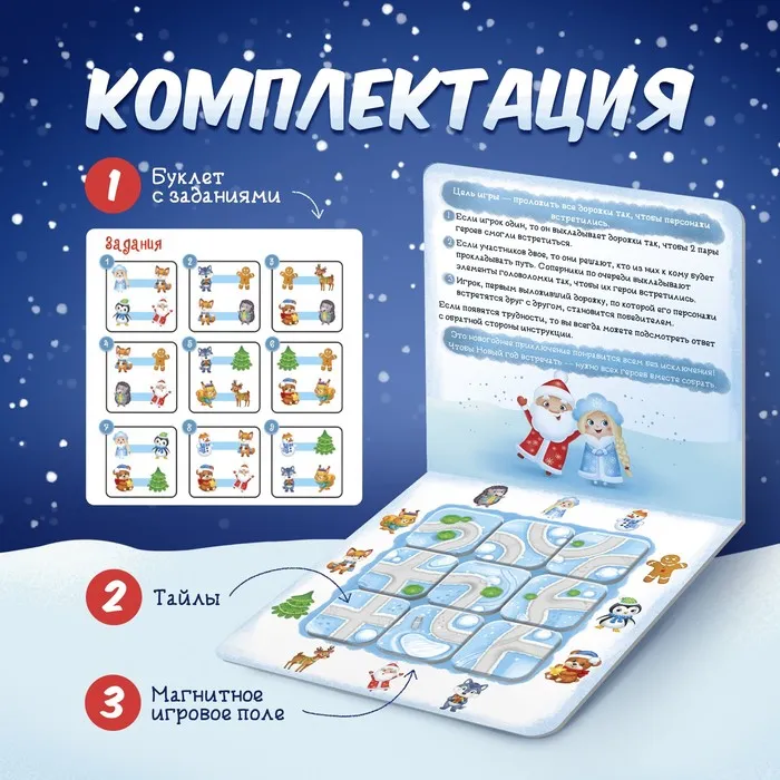 Магнитная настольная игра «Новогодний марафон» рекомендована детям старше 5 лет и рассчитана на 2–4 игроков.