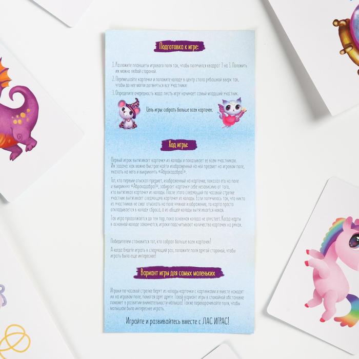 Цель игры — набрать как можно больше карточек. А как это сделать? Один из игроков открывает верхнюю карту в колоде. Теперь задача всех участников: как можно быстрее найти изображённый на ней предмет на игровом поле, указать на него и выкрикнуть «абракадабра!».