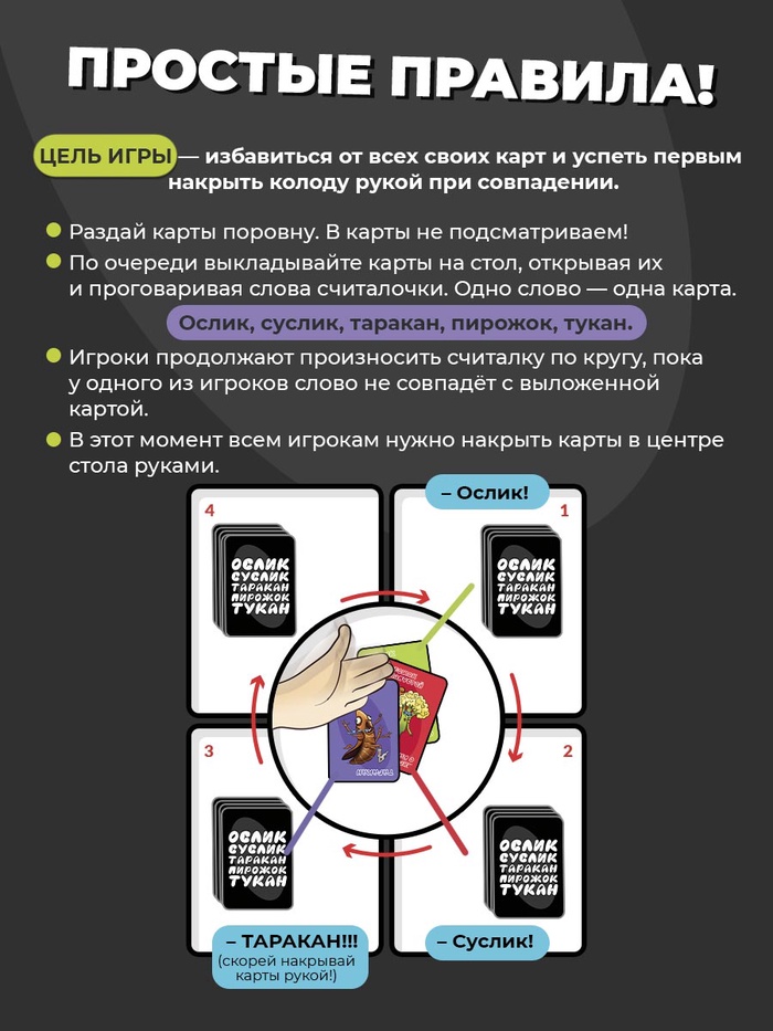 «Ослик, суслик, таракан, пирожок, тукан» — настольная игра для всей семьи. Увлекательная настолка зарядит яркими эмоциями и сделает любую вечеринку ярче и веселее. Цель игры — избавиться от своих карт и после этого первым накрыть рукой карты в центре стола.
