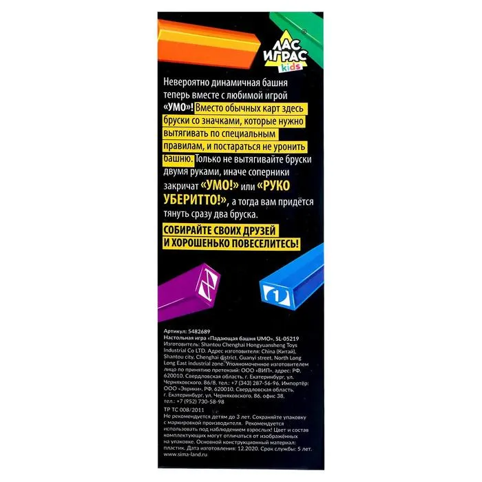 В процессе игры можно развивать не только реакцию и координацию, но и воображение. Игра закончится, когда башня упадёт. Идеально для шумных детских праздников!