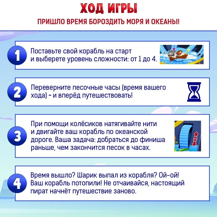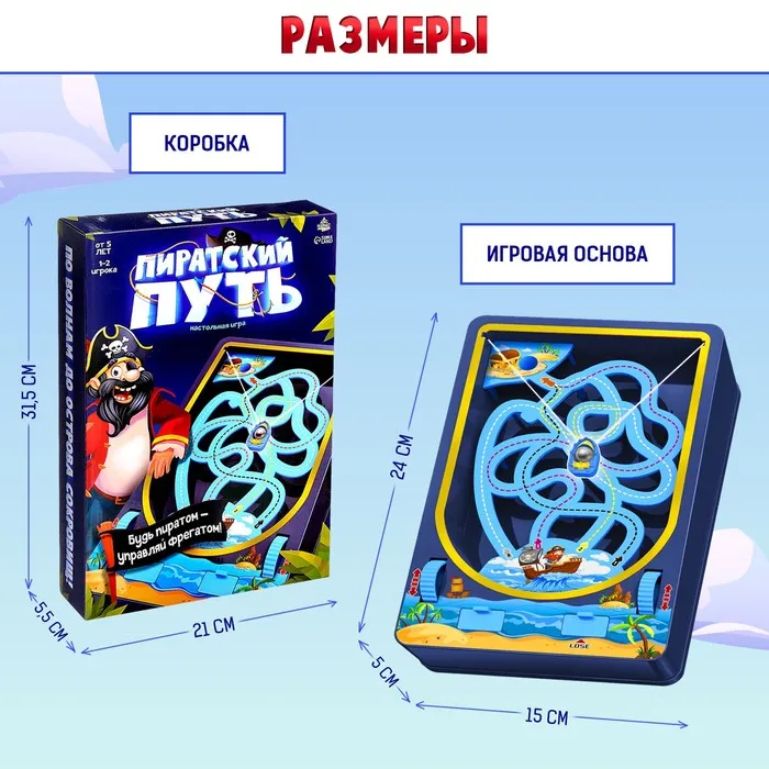 Почувствуйте себя настоящим пиратом с настольной игрой «Пиратский путь». Ваша задача — довезти сокровища до своего острова. Выберите один из маршрутов, полных опасностей, и доставьте сокровища за отведённое время.