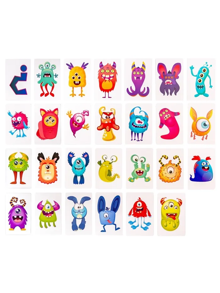 Игра состоит из 28 карт: 1 карта-выручалка и 27 монстриков. Колода карточек раскладывается на столе таким образом: карта с вопросом посередине, остальные карточки – вокруг вопроса. В итоге должен образоваться прямоугольник (7 х 4).
