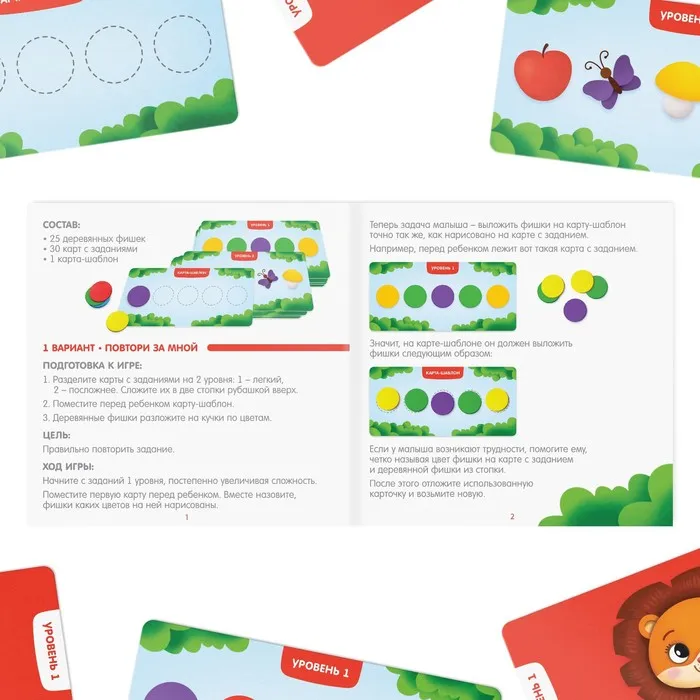 В этой игре ребёнку предстоит выкладывать деревянные кружки́ так, как показано на карте с заданием. Это поможет натренировать моторику, логику и пространственное мышление. Также есть 4 дополнительных варианта игры на развитие внимания и памяти.