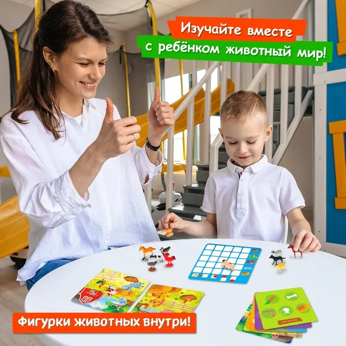 С настольной игрой «Привет с фермы» ребёнок прокачает логическое и пространственное мышление и научится определять положение вещей относительно других предметов.