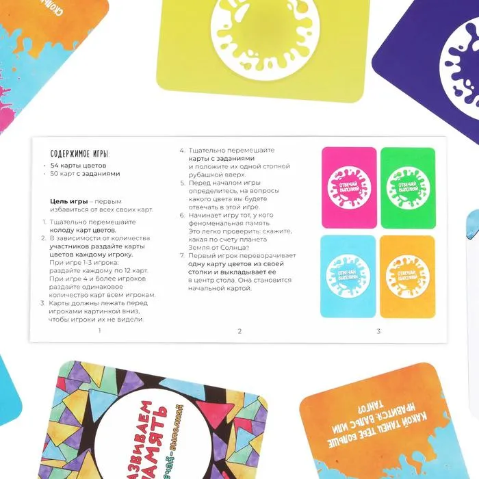У каждого игрока есть колода с разноцветными кляксами. Выкладывайте карты и запоминайте порядок цветов, которые на них изображены, а затем повторите их.