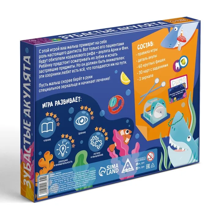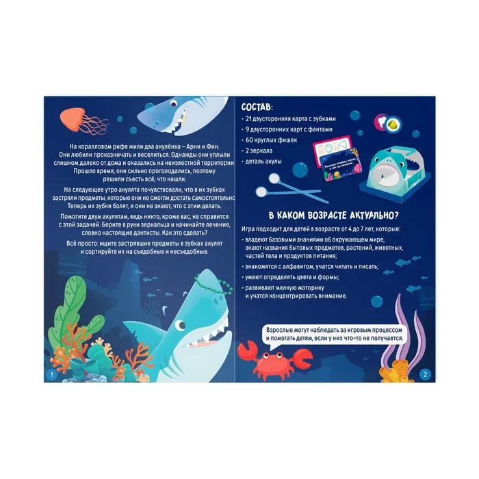 Настольная игра развивающая «Зубастые акулята», 30 карт, 60 фишек, 2 зеркала, деталь акулы, 4+ — Характеристики