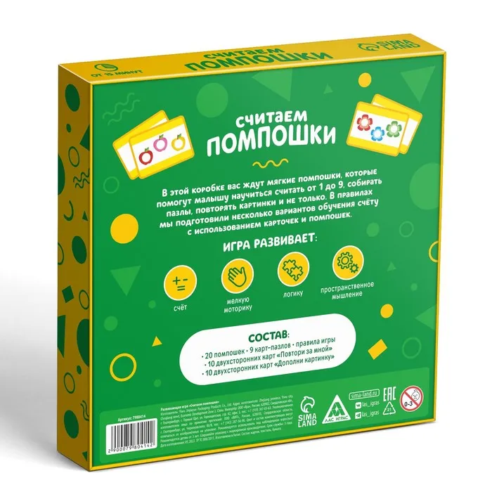 В этой коробке вас ждут мягкие помпошки, которые научат вашего малыша считать от 1 до 9, собирать пазлы и повторять картинки. В правилах мы подготовили 4 варианта игры, с которыми учиться считать станет намного веселее!