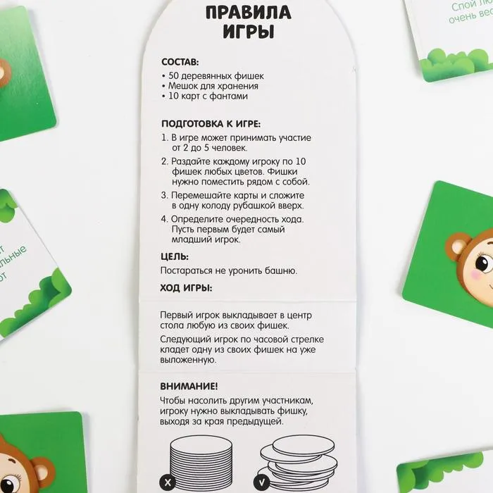 Раздайте каждому игроку по 10 фишек. А ещё перемешайте карточки с фантами и сложите в одну колоду рубашкой вверх. Осталось только определить очерёдность хода и начать игру.
