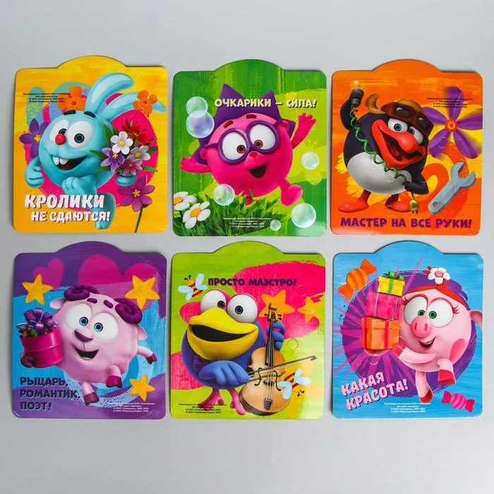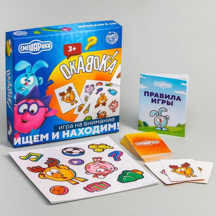 - 6 красочных карточек. Каждая карточка – новое задание с любимыми героями: Крошем, Нюшей и другими Смешариками. Меняйте карточки, чтобы игра оставалась интересной.