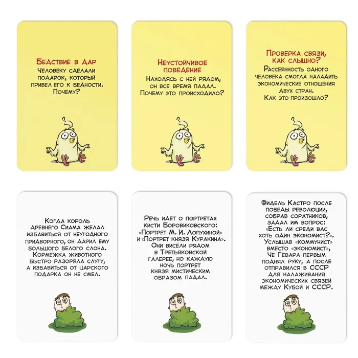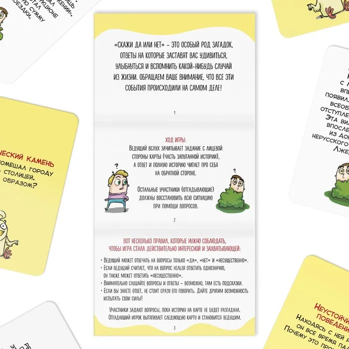 Играть в «данетки» очень просто – ведущий зачитывает часть запутанной истории, а отгадывающие должны восстановить всю ситуацию с помощью вопросов, на которые можно отвечать только «да» или «нет». Внутри коробки вы найдете 35 карточек с историями-«данетками», а отгадка заставит вас удивиться, ведь все написанное происходило на самом деле!