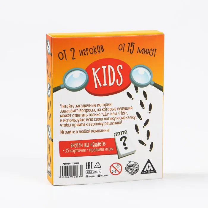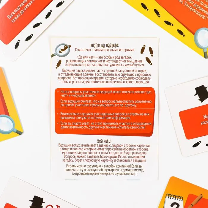 Ведущий зачитывает задание с лицевой стороны карточки, а ответ смотрит на обороте. Участники задают вопросы, пока история не будет распутана.