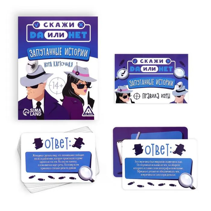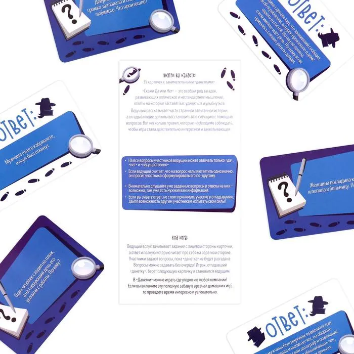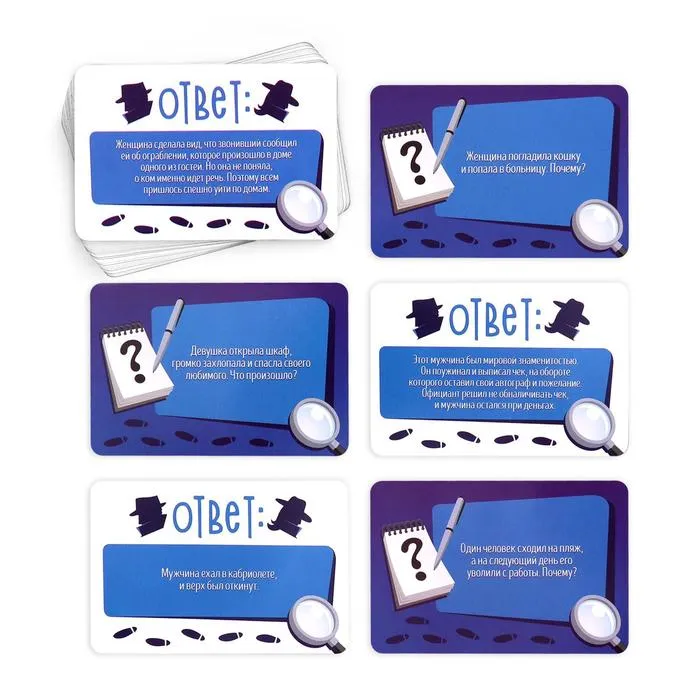 Ведущий зачитывает задание с лицевой стороны карточки, а ответ смотрит на обороте. Участники задают вопросы, пока история не будет распутана.