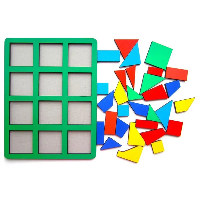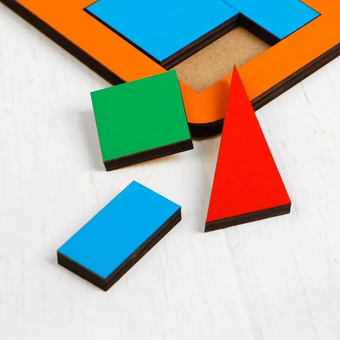 Задача малыша — собрать 12 квадратов из цветных элементов: треугольников, прямоугольников и других фигур. В процессе ребёнок знакомится с новыми формами и цветами, учится соотносить части и целое. Постепенное усложнение заданий позволяет малышу самостоятельно осваивать материал и не прибегать к помощи родителей.