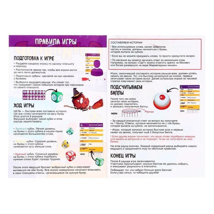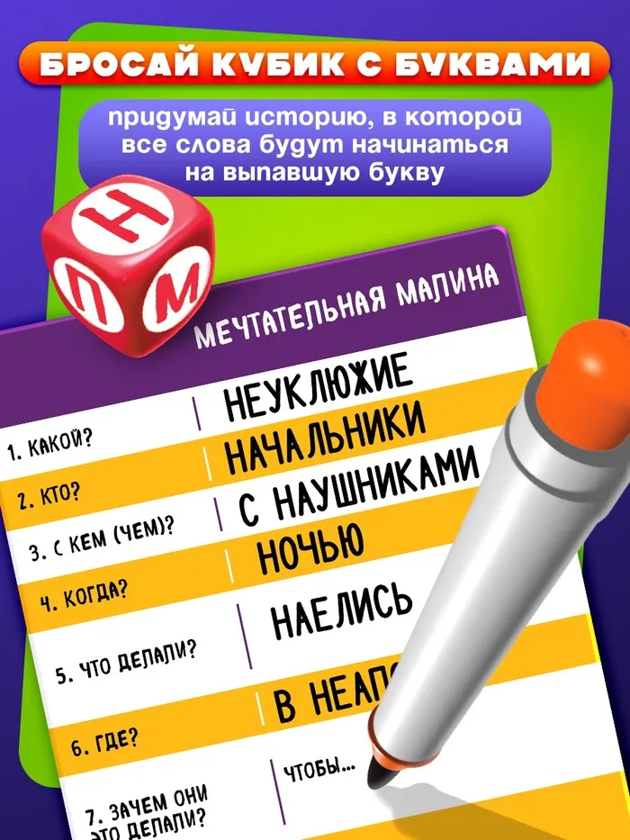 Быстрее всех составить историю, где все слова начинаются на одну букву. Игра длится 6 раундов.