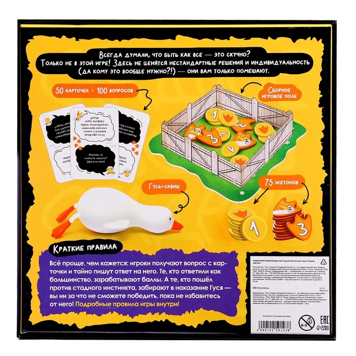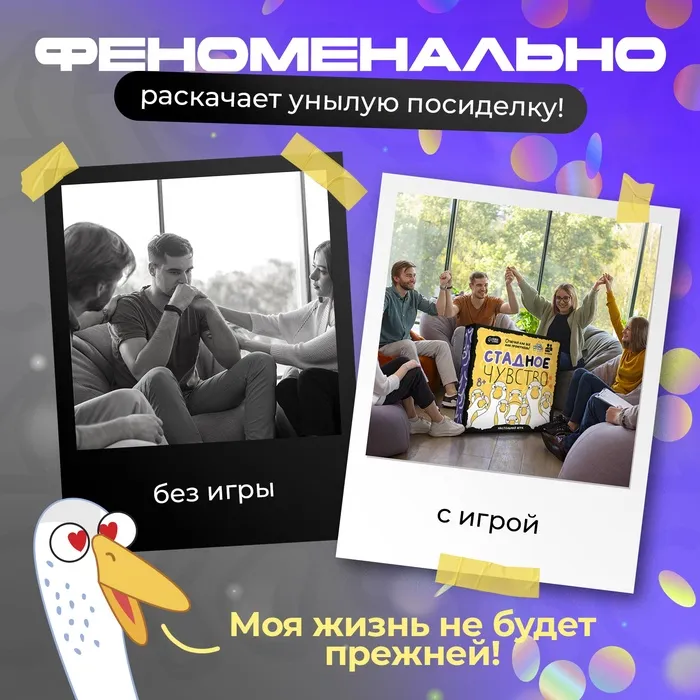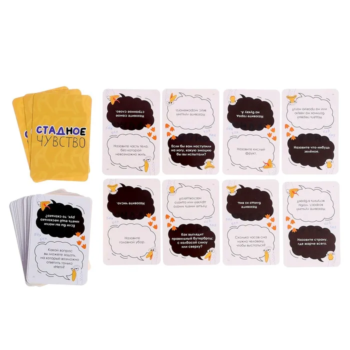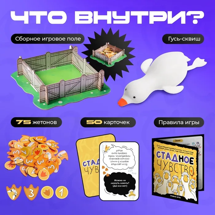 Проверь, насколько ты «свой» в компании! Настольная игра «Стадное чувство» — это увлекательный способ провести время с друзьями или семьёй. Игра идеально подходит для тех, кто любит общение и готов отвечать на вопросы так, как это делает большинство. Главное правило: не выделяйся, чтобы избавиться от гуся и победить!