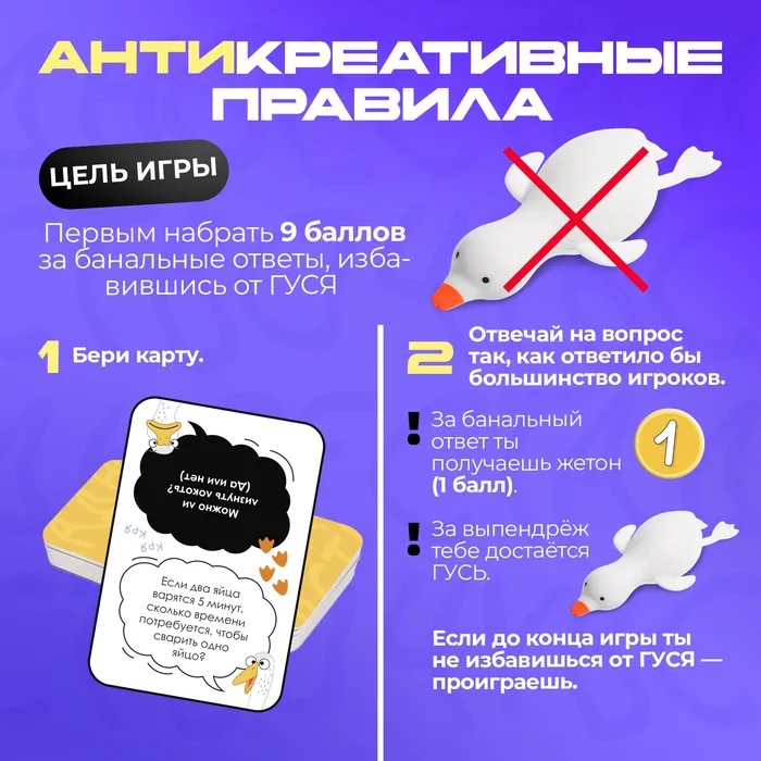 - Простые правила. Игроки по очереди берут карты с вопросами и отвечают на них так, как, по их мнению, ответило бы большинство. Банальные ответы приносят баллы, а оригинальные — нежеланного гуся. Чтобы победить, нужно первым набрать 9 баллов и избавиться от ГУСЯ.